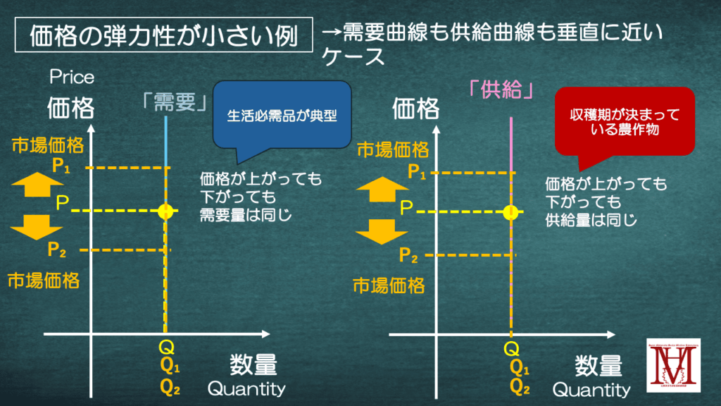 一方で、曲線が垂直に近い場合を見てみましょう。このときは価格が大きく動いても、数量はほとんど変化しません。需要の例では、水や電気、医薬品のような生活必需品が典型です。値段が上がっても「必要だから買わざるを得ない」ため、需要量はほとんど変わりません。供給の例では、コンサート会場の座席数や、天候に左右される農作物など、供給量が物理的に決まっていて動かせないケースがあります。いくら価格が上がっても下がっても、供給できる量は変わらないのです。つまり、垂直に近いときは「価格に鈍感=弾力性が小さい」状態です。